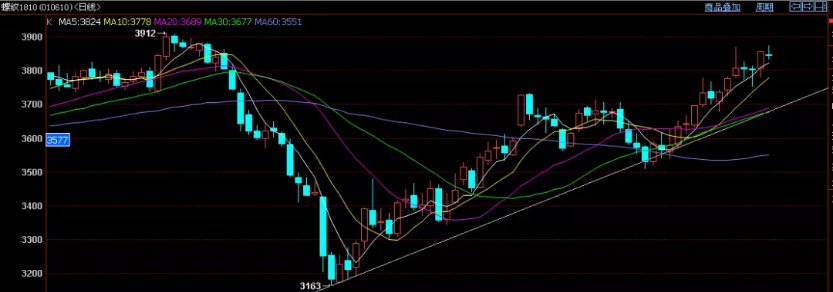 期螺主力RB1810近日已上漲至3800上方,距離前期3912的高點(diǎn)為時(shí)不遠(yuǎn),考慮到近兩周累計(jì)漲幅已達(dá)300點(diǎn),本就有一定技術(shù)性回調(diào)需要,期螺在3900附近必定會(huì)遭遇較強(qiáng)阻力。但從長(zhǎng)期行情看來(lái)看,期螺整體仍處于上升態(tài)勢(shì),短期的階段性回調(diào)對(duì)整體行情并無(wú)阻礙,因此可以預(yù)計(jì)后期期螺行情在經(jīng)歷一段回落后7月或仍以震蕩上行態(tài)勢(shì)為主。